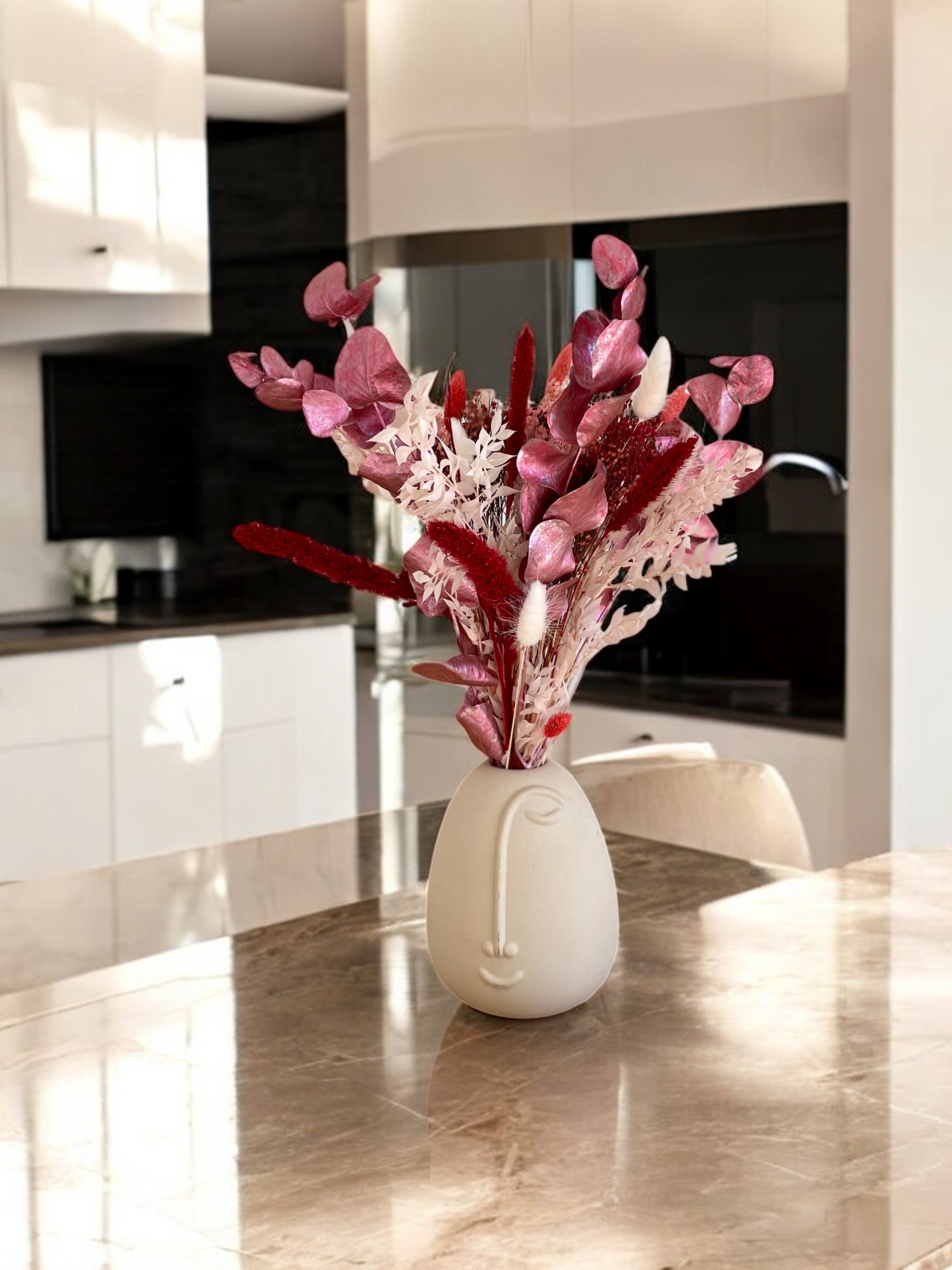 Un bouquet envoûtant où le broom bloom rouge et la sétaire séchée apportent intensité et caractère, tandis que les nuances tendres du broom bloom vieux rose et du ruscus stabilisé créent une harmonie subtile. L’eucalyptus or rose ajoute une touche précieuse et délicate, sublimant cette création pleine d’élégance et de poésie.